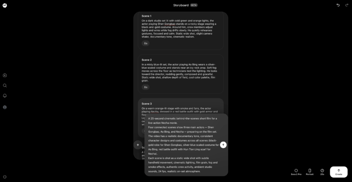 这里我们创建了 4 个场景,前面三个分别是申公豹、敖丙和哪吒的片场花絮,各 6s,最后一个是三个演员在一起的幕后视频,7s,累计刚好 25s。