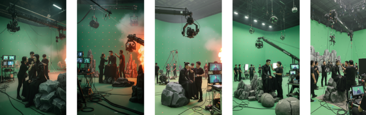 图四到图五:真实的片场抓拍记录。场景整体设定,场地氛围:绿幕前的大型摄影棚,吊威亚装置、风机、烟雾机正在测试。布景一半是CG标记的山岩、一半是实景假石台。灯光是冷绿调主光+背后橙红火焰反光(呼应哪吒的火焰特效)。周围能看到线缆、风机、摄影机机械臂、现场监视器播放刚拍的镜头。人物状态:演员(上传图片中的角色)穿着身上的精致黑金戏服,正在布置妆发,且妆发未完全完成,额头和鬓角贴着特效贴片。他坐在高台边,低声跟导演沟通角色的「冷笑角度」和动作节奏。化妆师拿小刷子在他眼角补色,特效组在调节额头的光效。背景有人在做威亚准备,吊臂缓慢升起,吊绳拉紧。