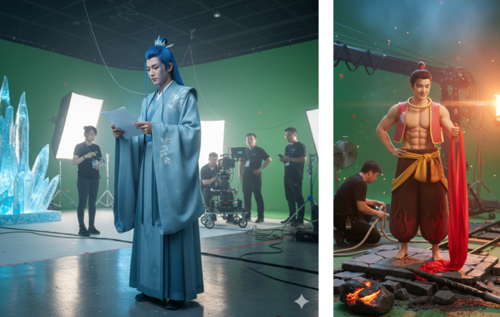 继续同样的流程,我们可以得到敖丙、哪吒的真人幕后图片和视频。把他们剪辑在一起,就可以以假乱真地说,「哪吒真人版电影选角定了,片场幕后视频曝光。」