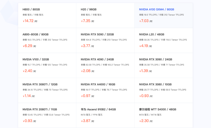 ▲ 部分显卡租赁平台显示的 A100 售价为 7元/时