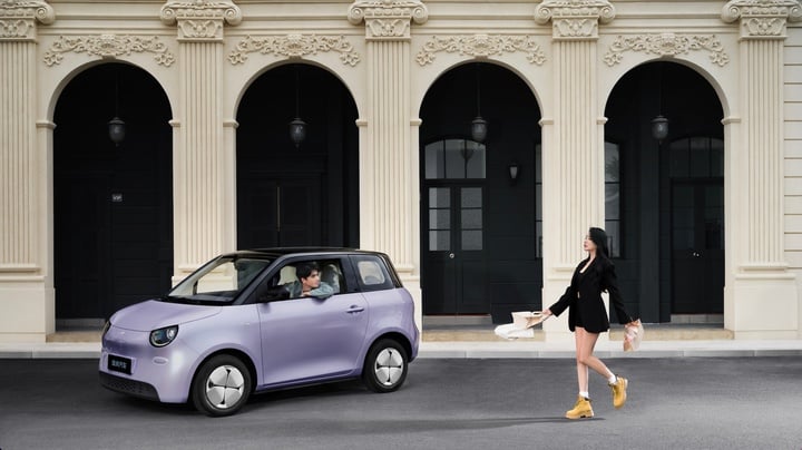 为了迎合年轻用户,埃尚 A100C 提供了多达 7 种车身配色,名字起得也很有网感,比如紫定行、白月光、被圈粉、一定银、放青松、很辉黄、嘿嘿黑。车身侧面还做了悬浮式车顶的效果。