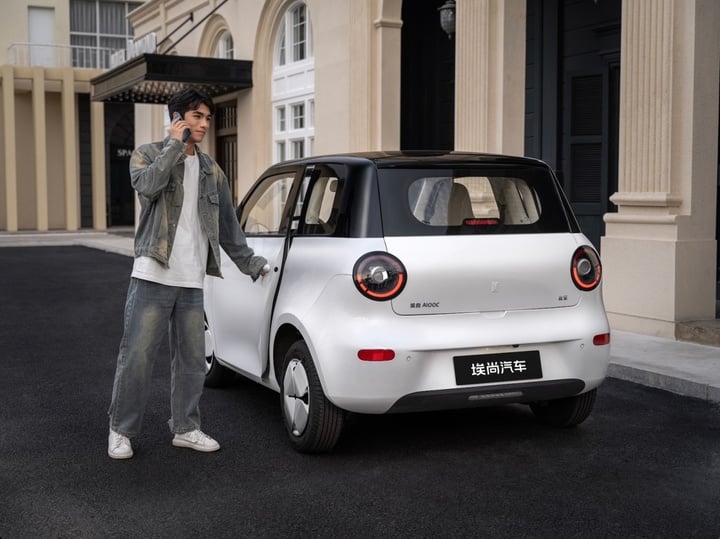 这辆车的长宽高分别为 3285/1708/1550mm,轴距为 1980mm。车尾的设计很简洁,同样是圆形尾灯与车头相呼应。重点在尾标,左侧是「埃尚 A100C」的车型名称,而右侧,是两个关键的汉字——森源。