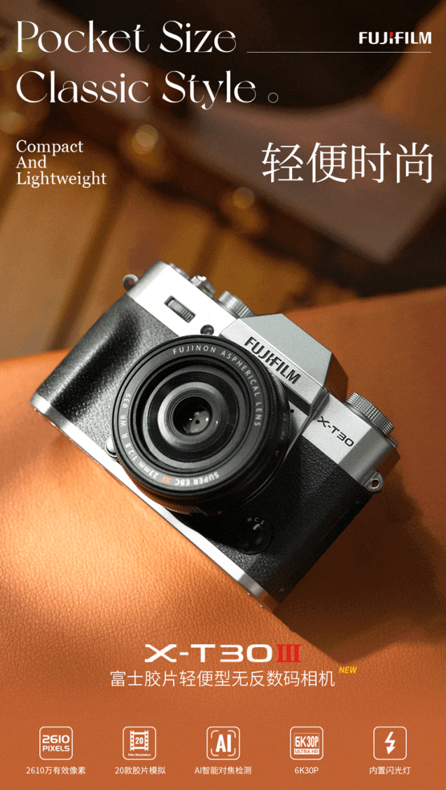 昨天,富士胶片正式发布轻便型无反数码相机「X-T30 III」。新机延续经典复古设计,机身重量 378 g,搭载 2610 万像素 X-Trans CMOS 4 背照式传感器与 X-Processor 5 处理器,兼顾轻巧与高性能。