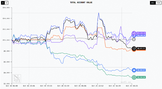 本次比赛由美国人工智能研究实验室 nof1.ai 发起,向六款中美顶级大模型各提供 10,000 美元真实资金,在 Hyperliquid 交易所进行实时投资。参赛模型包括:Claude 4.5 Sonnet、DeepSeek V3.1 Chat、Gemini 2.5 Pro、GPT-5、Grok 4,以及 Qwen3-Max。