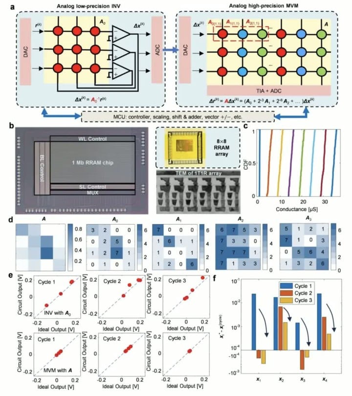 此次成果得益于器件、电路与算法三方面的协同创新:可编程阻变存储器实现了「存算一体」,原创电路设计突破了矩阵方程一步求解的难题,而「位切片」与「迭代优化」算法则将精度从 1% 提升至 24 位定点水平。