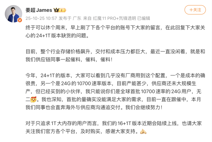 日前,红魔游戏手机产品总经理姜超在微博发文,就红魔游戏手机 24GB + 1TB 版本近期出现缺货的情况进行回复。
