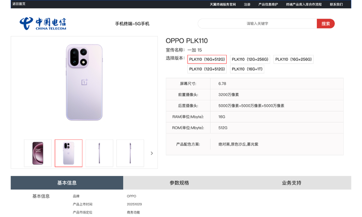 昨天,一加 15 已现身中国电信终端产品库,型号为「OPPO PLK110」。该机计划于今日正式发布。