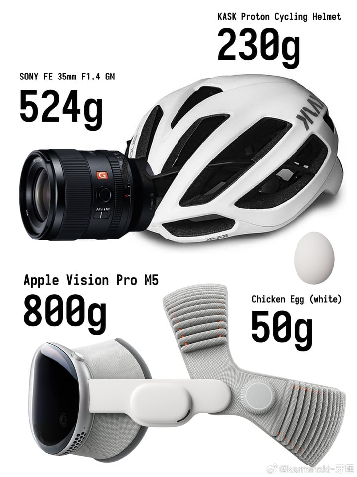 由于使用了全金属的机身,以及正面多了一块屏幕,上一代 Vision Pro 已经是头显产品中的重量之最了。而今年的 M5 Vision Pro 换用了新款头带,整机重量更是从 M2 机型的 600g 增长到了 800g ——