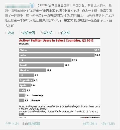 根据 The Next Web 的调查,这则消息来源于亚洲的 eMarketer raised eyebrows 网站,发布不久之后遍传遍全球。该网站声称 Twitter 在中国有 3550 万个活跃用户,而注册用户有 7000 万个,社交网站巨头 Facebook 在中国有 1.25 亿个注册用户。而真正的消息来源是一个位于伦敦的 GlobalWebIndex 网站。GlobalWebIndex 在亚洲时间本周五(美国时间周四)通过 Bloomberg 的报道发布了完整的图表,随后便被 Techmeme 转载,成功吸引了众人的眼球。