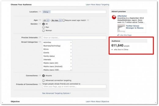 Facebook 在自己的广告平台上贴出了他们自己做的统计表明,记录中 13 岁以上的中国用户数目为 611640 个。远低于 GlobalWebIndex 发布的数据。