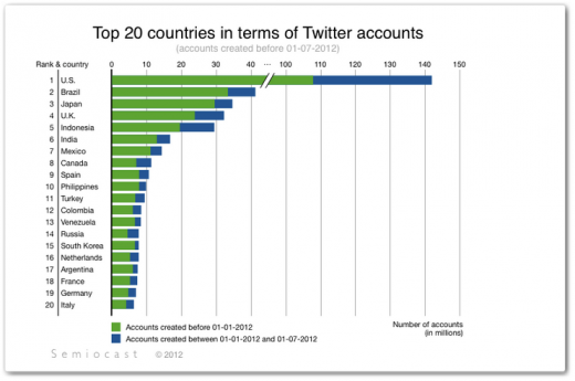 自从 Twitter 有意识地加强信息保护之后我们就很难找到精确的用户数据,但最近一个颇有权威的研究组织 Semiocast 也发布了与 GlobalWebIndex 相去甚远的数据。