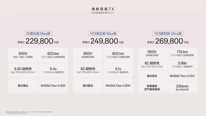 焕新款极氪 7X 分了 3 个版本,区别仅有电池容量、空悬以及四驱,其他配备基本一致,具体为: