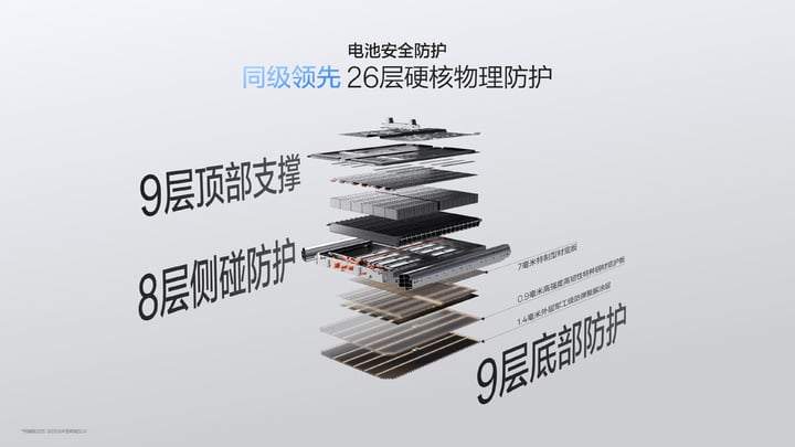 对于碰撞后电池起火的风险,极氪表示 7X 采用的麒麟电池底部采用 9 层电池防护设计,安装了 7mm 特制型材底板、0.9mm 高强度高韧性的特种钢材底护板、外层 1.4mm 军工级防弹聚脲涂层,可以 • 逐层吸收能量,保障电池托底安全,有效避免电池受挤压后起火。
