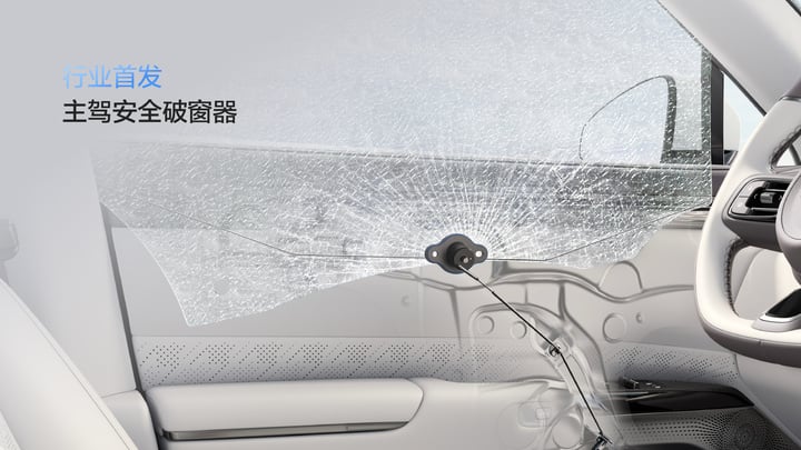 安装在极氪 7X 主驾处的破窗器简单易操作,仅需约 50N 大小的力即可触发,破窗器被激活后,作用在玻璃上的顶针瞬间冲击力最高可达 3,000N,约是普通安全锤撞击力的 33 倍,相当于 5 个成年男性总重量同时撞击玻璃一点。