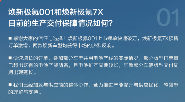 由于焕新极氪 001 和焕新极氪 7X 订单快速增长,叠加部分版型共用电池产线导致订单量超出了出既有电池产能储备,导致部分车辆的交付周期出现了延长。