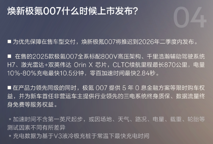 近日,极氪官方宣布,原定于四季度发布的焕新极氪 007,将推迟到 2026 年二季度内发布。