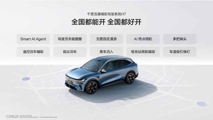 焕新款极氪 7X 此次采用了吉利自研的「千里浩瀚辅助驾驶系统 H7 方案」,可以实现 D2D 车位到车位领航辅助,NZP 城市自主领航、APA 泊车辅助等多项功能。