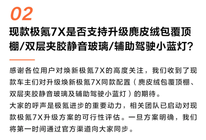 老车主们也并未被忘记,极氪官方表示,目前正在积极研究现款车型升级麂皮绒车顶、双层夹胶玻璃以及辅助驾驶小蓝灯的方案。