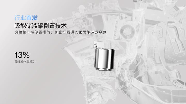 在碰撞场景中,极氪 7X 的高压配电盒主动滑落防护机制能在最高 105km/h 的碰撞后翻转下移,避开侵入挤压;后保险杆位置部署的专属压力传感器,可以在毫秒级内切断高压电,确保安全;吸能储液罐倒置技术则让空调储液罐兼任吸能盒,减少 13% 碰撞侵入量,并在碰撞时将白雾向下排放以防窒息。