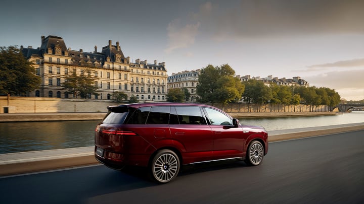 外观上,N8L 延续了家族设计,但线条要比 N9 简洁不少。它采用了分体式大灯和双翼造型的日行灯,车身侧面线条比较方正,配备 21 英寸轮圈、隐藏式门把手和电吸门,同时还支持手势开门和 AR 投影尾门。