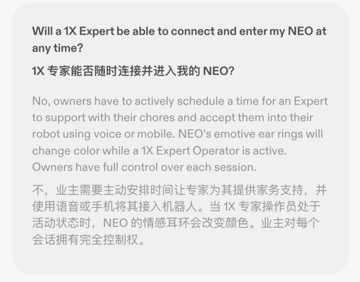 1X 公司的 CEO 花了非常多的时间来解释这件事情的可靠性,例如用户可以划定区域,哪些地方是幕后操作员不能让 Neo 进去的;还有幕后操作员的每次行动,都必须先得到用户的许可;Neo 身上的麦克风什么时候被唤醒;数据的加密等等。