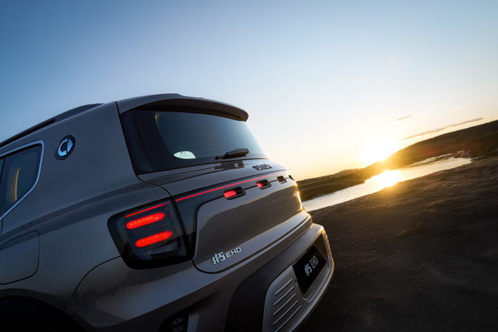精灵 #5 EHD 在封闭式的前脸中融入了名为「时空胶囊」的贯穿式 LED 矩阵式大灯,尾部设计和前脸相呼应,点亮后的辨识度不错,前后包围均使用了银灰色护板,为车辆增加了不少硬派越野的气质。