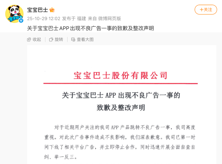 昨日,宝宝巴士股份有限公司就上述事件发布致歉及整改声明。宝宝巴士方面在第一时间下线了相关平台广告,并立即停止合作,同时迅速开展全面自查自纠、举一反三。