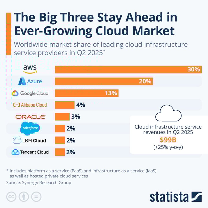 ▲2025 年,亚马逊云服务 AWS 市场份额占据领先地位