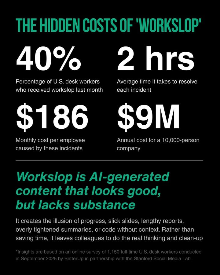 毕竟,就目前而言,AI 带来的除了效率,还有大量的「workslop」,workslop 指的是那些由聊天机器人产生的、看似像回事但实则毫无价值、甚至充满错误的「工作垃圾」。
