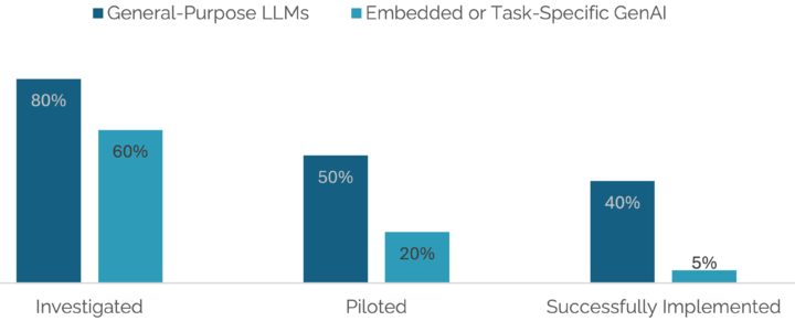 ▲ 从试点到实际应用,对于具体任务的 AI(浅蓝色)引入下降明显,成功实施仅有 5%
