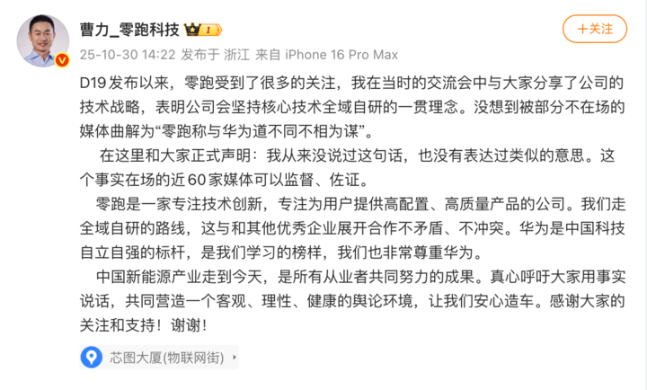 零跑科技高级副总裁曹力昨日在微博发文,否认曾发表「与华为道不同不相为谋」的言论。