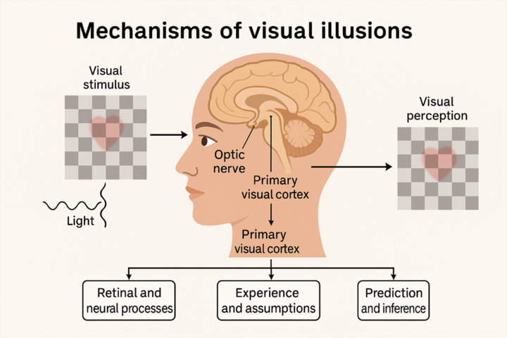 主流的解释方案,集中在眼睛部位,视网膜神经元的侧抑制作用,这会让我们在看一张图片时,放大边缘部分;还有视觉暂留、眼球微动等解释。