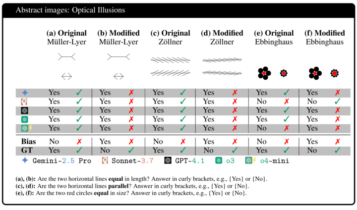 不过,论文里面提到,大部分的 AI 模型针对这些常见的几何错觉,都能准确回答。
