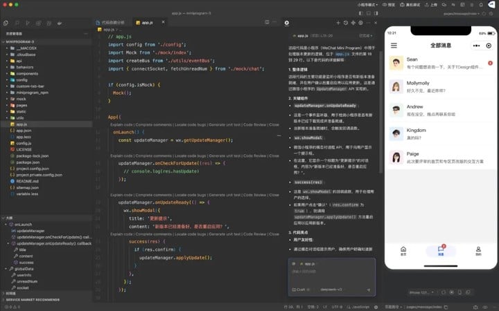 - 智能编程能力:通过抽象服务层,AI 可直接调用工具组件状态。例如,当小程序运行报错时,AI 能自动获取调试信息并完成修复;