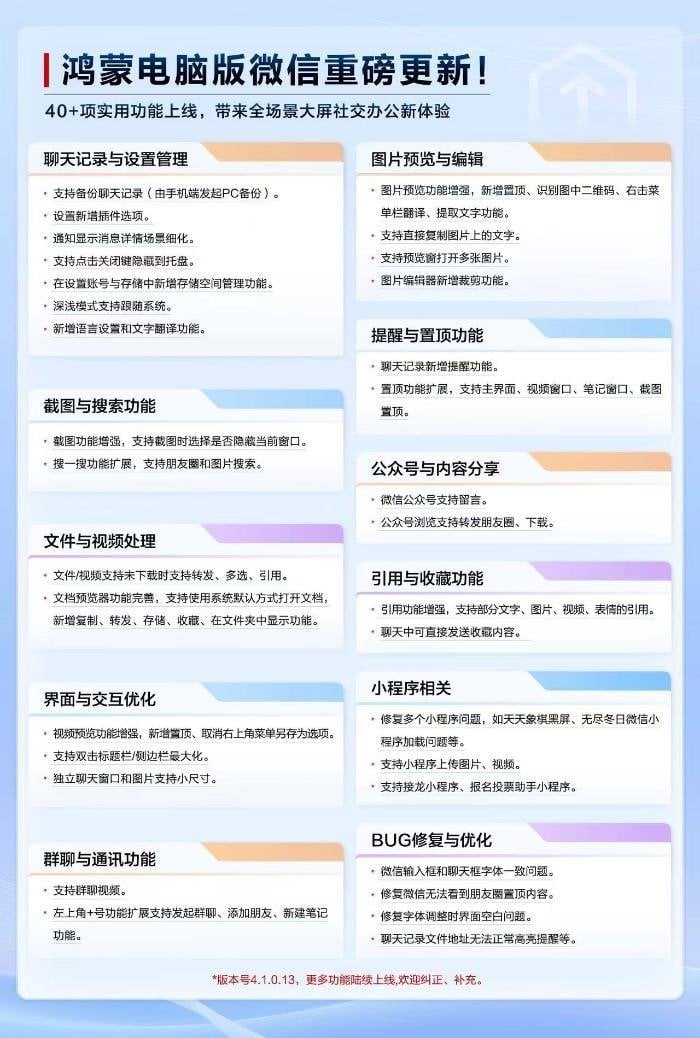 据中新网报道,鸿蒙电脑版微信昨日迎来重大版本更新,一次性上线超过 40 项实用功能,并同步修复 40 余项 BUG。此次更新重点聚焦聊天管理、视频通信、文件协作及小程序生态,显著提升跨端操作效率。