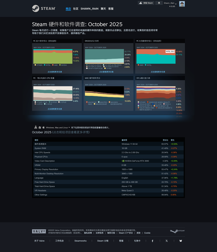 昨天,V 社(Valve)公布了 2025 年 10 月 Steam 软硬件调查结果。