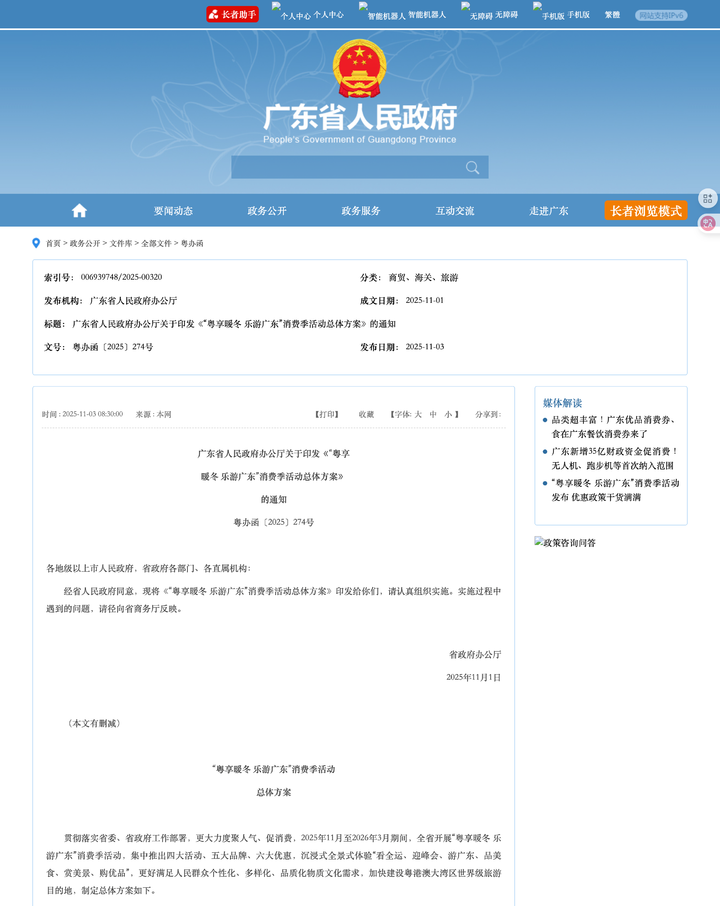 广东省政府昨日公布《「粤享暖冬 乐游广东」消费季活动总体方案》。方案显示,活动已于 11 月 1 日启动,将持续至 2026 年 3 月底,旨在通过多层次促消费举措,推动文旅、餐饮、零售、体育等领域的消费增长。