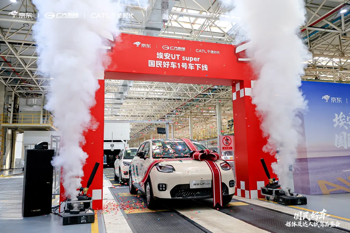 据易车昨日报道,京东、广汽集团、宁德时代联合推出的「国民好车」——埃安 UT super 1 号车正式迎来下线。这也是该款新车首次对外完整展示外观设计、制造工艺、电池技术及换电过程等细节。