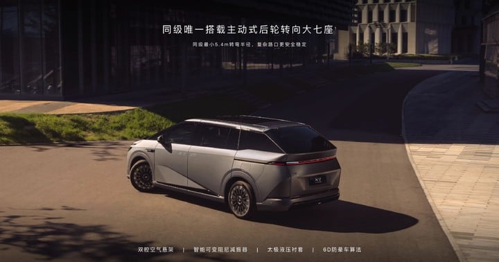 而在动态表现上,小鹏今晚仅提到 X9 超级增程配备了主动式后轮转向系统,可实现最大 10 度后轮转角,将转弯半径压缩至 5.4 米,极大缓解了大型 MPV 在狭窄街道掉头或停车时的窘境。