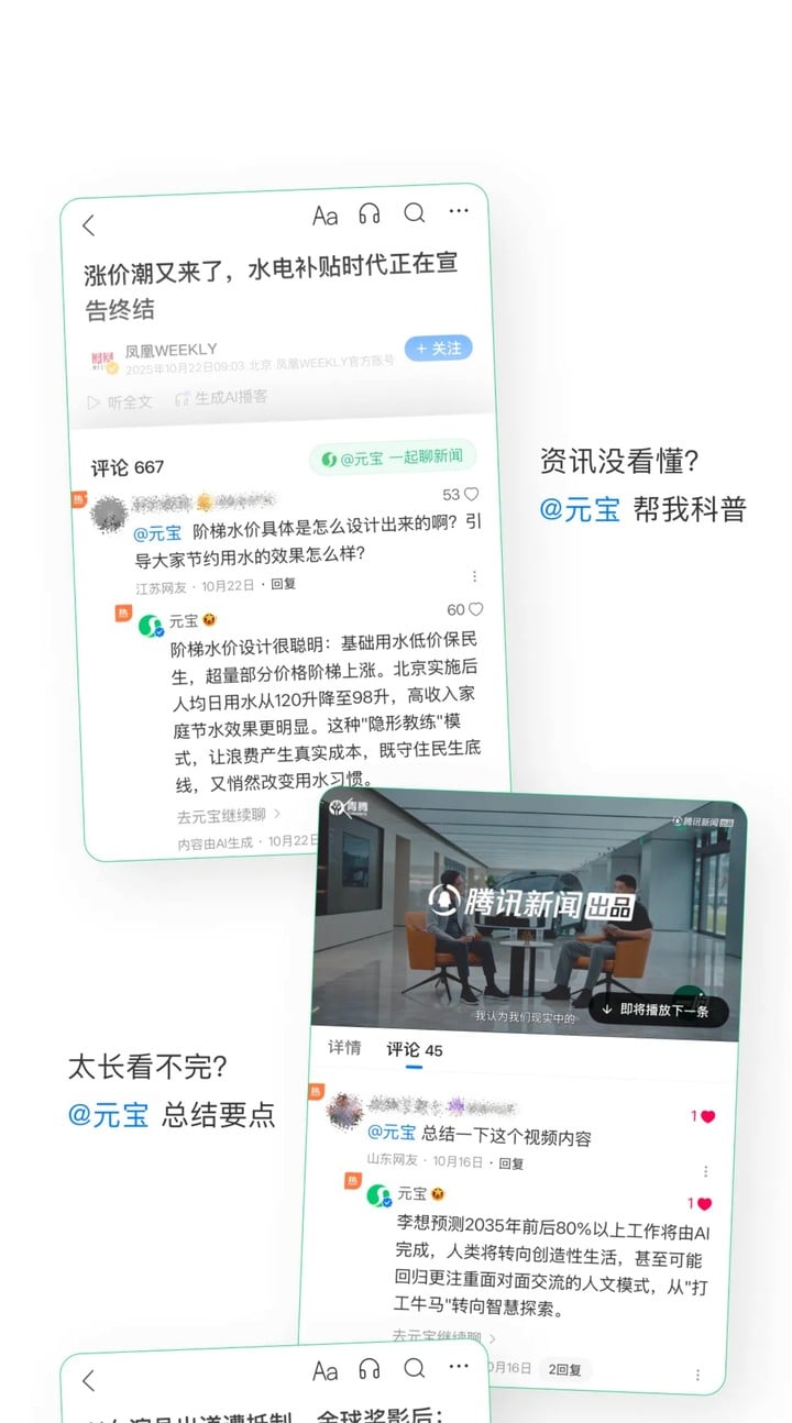 昨天,腾讯元宝宣布已全面接入腾讯新闻 App 评论区。用户可通过输入「@元宝 + 需求」的方式,与 AI 实时互动,实现新闻摘要、要点提炼与观点延伸等功能。