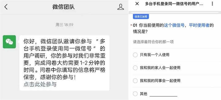 昨天,部分用户在社交平台发帖,称收到了来自微信团队关于「多台手机登录同一微信号」用户调研的邀请。