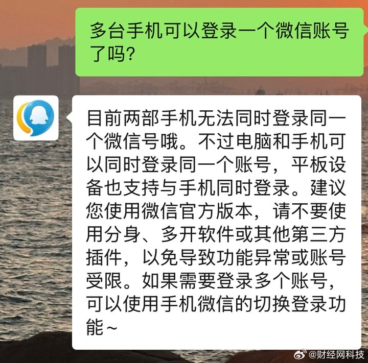 据财经网报道,微信客服就此事作了回应:目前两部手机无法同时登录同一个微信号。不过电脑和手机可以同时登录同一个账号,平板设备也支持与手机同时登录。