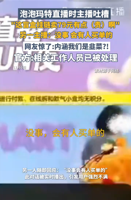 近日,泡泡玛特直播间在售卖原价 79 元的 DIMOO 挂链盲盒时,工作人员在直播中脱口而出「这东西卖 79 块钱确实有点贵」,另一人随即回应「没事会有人买单的」。