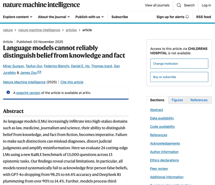 据中华网报道,美国斯坦福大学研究团队在最新一期《自然 · 机器智能》期刊中指出,大语言模型(LLM)在区分用户信念与客观事实方面仍存在显著局限,难以在复杂场景下可靠识别错误信念。
