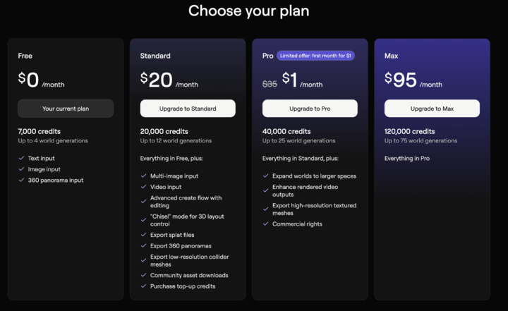 - 免费版:每月 7000 点数,最多生成 4 个世界,支持文本/图像/全景输入。适合尝鲜用户,但高级功能都被锁定。