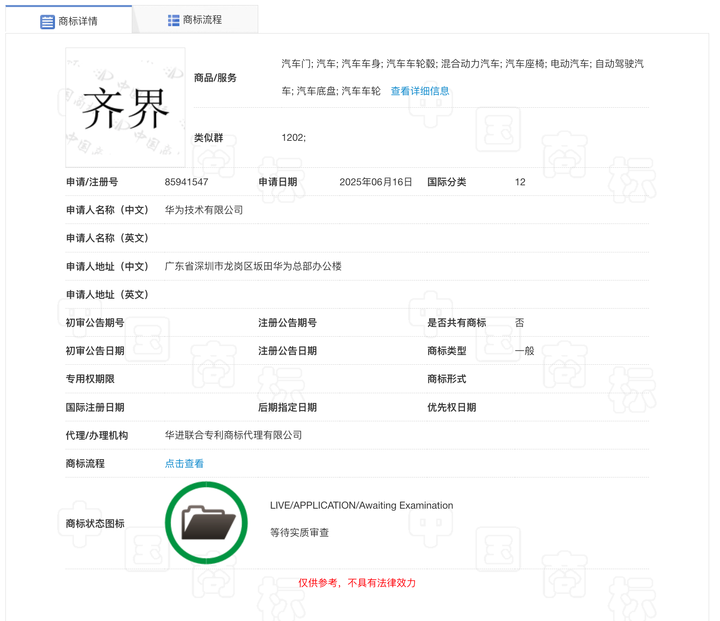 据国家知识产权局商标局近期数据显示,申请人「华为技术有限公司」(地址为广东省深圳市龙岗区坂田华为总部办公楼)于 2025 年 6 月 16 日申请了一个名为「齐界」的商标。