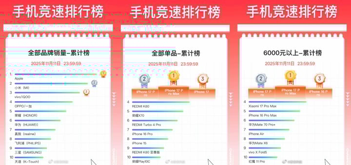 具体机型方面,全价格段总销量榜中,iPhone 17 Pro Max、iPhone 17 Pro、iPhone 17 霸榜前三,而后为 REDMI K80、荣耀 X70、REDMI Turbo 4 Pro 等机型。