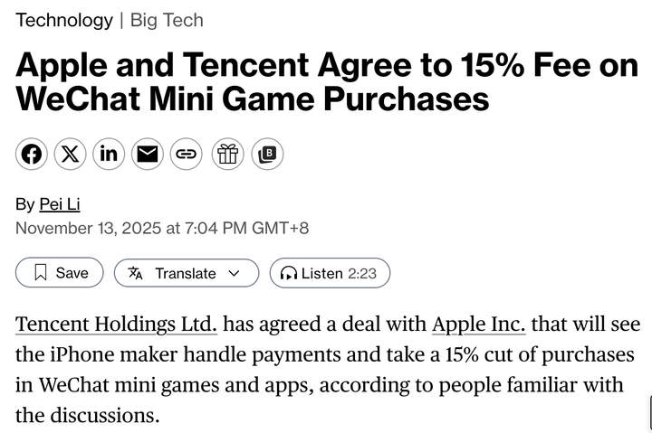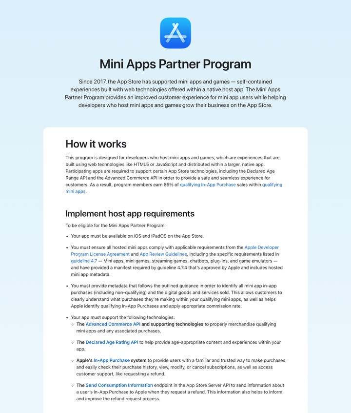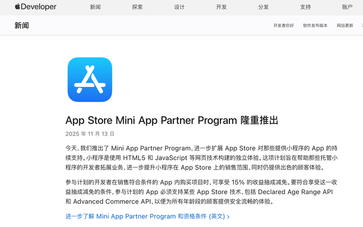 就在刚刚,苹果悄然发布了一个可能会改变应用生态的计划——小程序合作伙伴计划(Mini Apps Partner Program),正式宣布为小程序建立制度化的合规框架。