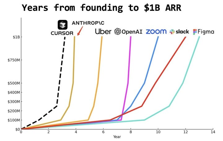有多热,代表性产品 Cursor 在最新一轮融资后,估值来到了 300 亿美元,并且它几乎可以确认,将是历史上最快达到 10 亿美元 ARR 的公司。