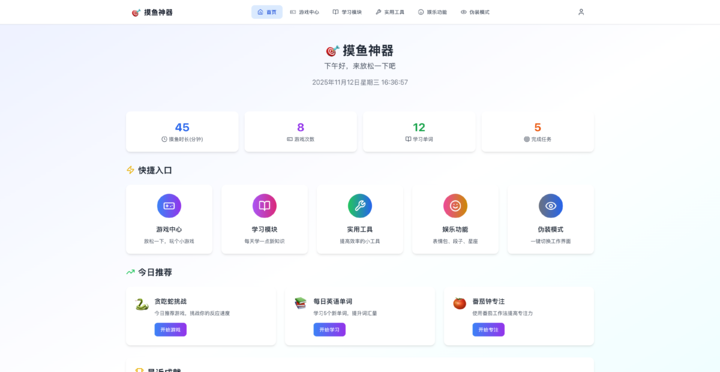 一切顺利,我们得到了最后的摸鱼 App,TRAE 还贴心的提供了一个推荐操作,让我们把项目部署到 Vercel(托管网站的平台)上,而不仅仅是本地访问。